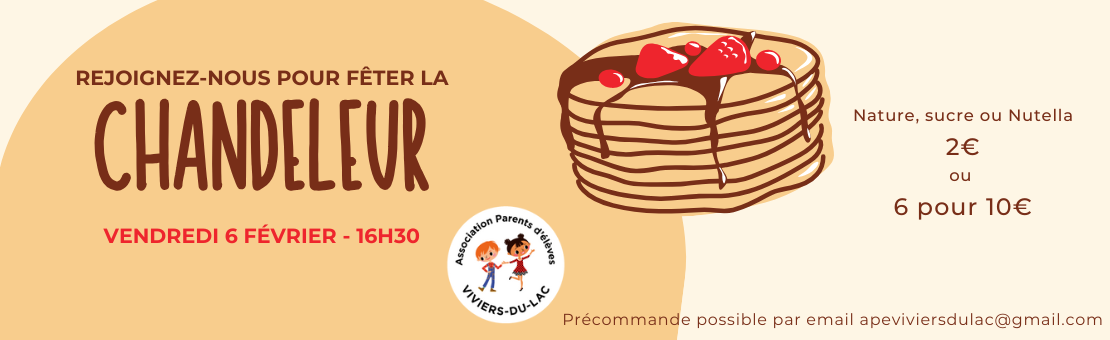 Publié : 15/01/2026 | Catégories : EvènementsRendez vous le vendredi 6 février à partir de 16h30. L'APE fête la chandeleur avec une vente de crêpes, en musique, devant la salle APE. Achetez vos crêpes pour le gouter, à déguster sur plac [...]
